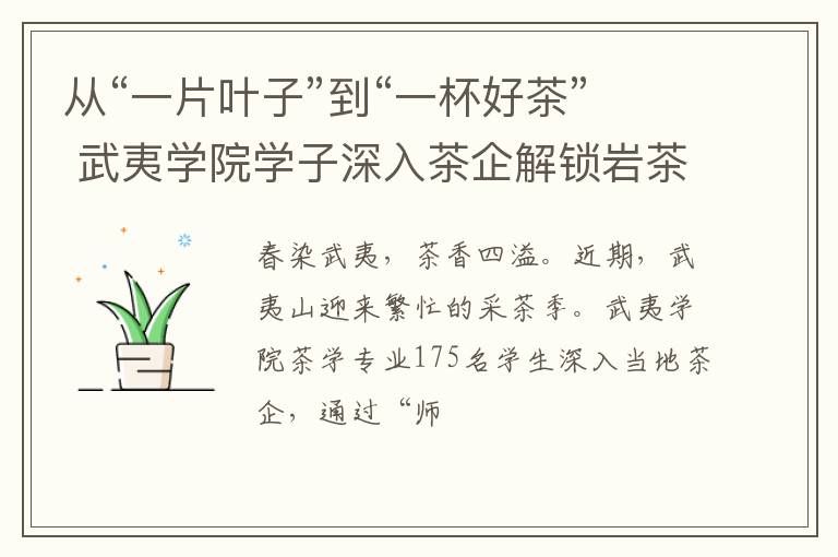 春染武夷,茶香四溢。近期,武夷山迎来繁忙的采茶季。武夷学院茶学专业175名学生深入当地茶企,通过“师徒制”学习实践方式,参与武夷岩茶制作全过程,领会传统制茶技艺的核心要领。这种理论结合实践的教学模式,不仅是技艺传承的生动课堂,更是培育人才的重要途径,是学校落实“三茶”统筹发展理念的生动缩影。