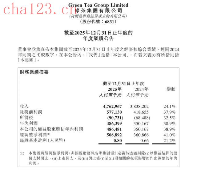 年报显示,2025年,绿茶集团实现营业收入47.63亿元,增速飙升至24%;年内利润4.86亿元,同比提升38.9%;经调整净利润5.09亿元,同比上升41%。