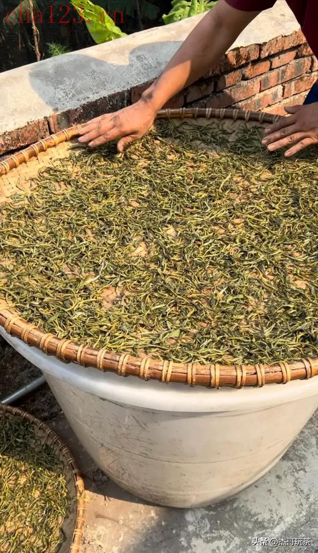 摊晾的作用是让茶叶散热,避免产生发酵带来的内涵物质消耗,同时使鲜叶适度失水(走水),茶叶变软,便于之后杀青,炒制时不容易折断,摊晾时间过久会让茶叶开始像白茶一样轻发酵,香甜度增加,但内含物质提前被消耗,越存越淡。