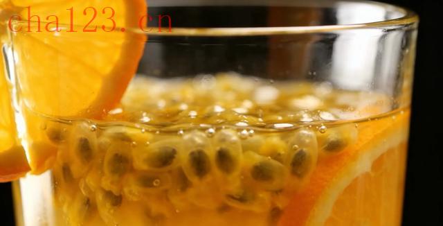 配方:百香果肉1个、橙子薄片2片、糖浆25ml、茉莉花茶200ml、满杯冰。