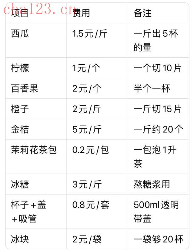西瓜、柠檬、百香果、橙子、金桔、茉莉花茶包、糖浆(白糖:水=1:1熬制)、制冰厂批发的冰块(3元/袋)。